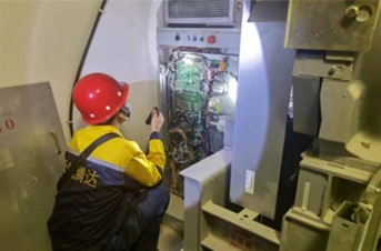维保人员在应急防控隔离酒店对电梯进行安全隐患排查,检查电梯部件,更换指令板和按钮