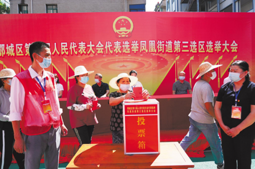 2021年9月12日,鄂州市辅人实验小学操场,鄂城区第十届人民代表大会代表选举凤凰街道第三选区举行选举大会,选民将选票投进票箱。当日,鄂州市鄂城区启动区乡两级人大代表换届选举。