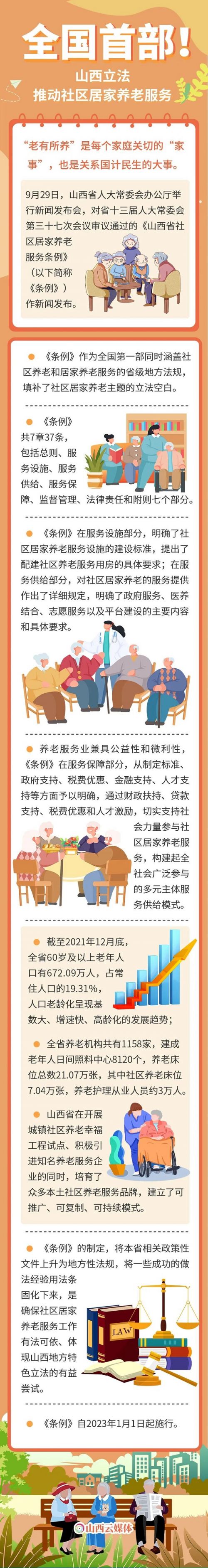 《山西省社区居家养老服务条例》日前经山西省十三届人大常委会第三十七次会议审议通过,将于2023年1月1号起施行。这是全国首部同时涵盖社区养老和居家养老服务的省级地方法规。