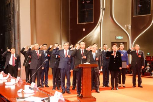 在2022年2月27日闭幕的南通市十六届人大一次会议上,王晖、吴新明等新一届市人大、市政府领导人员依法进行宪法宣誓。(南通市人大常委会供图)