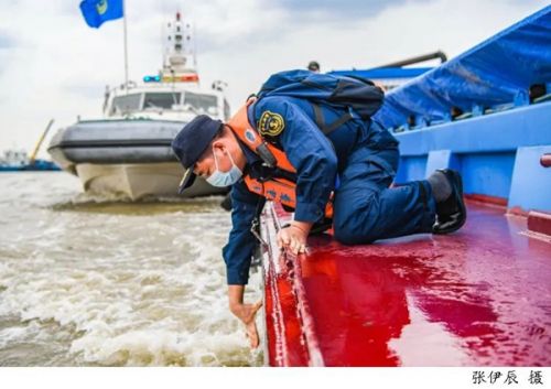 在多部门集中治理行动中,上海海事局执法人员正在核查船舶吃水情况