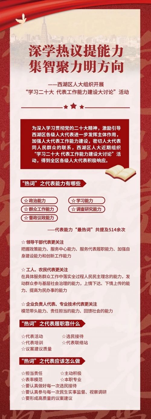 为贯彻落实党的二十大精神,进一步加强代表工作能力建设,近日,浙江省杭州市西湖区人大常委会组织全区人大代表开展“代表工作能力建设”线上大讨论活动,得到广大代表的热烈欢迎和积极响应。