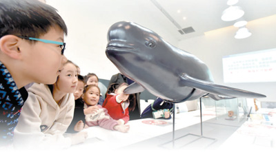 江苏省扬州市汶河小学的学生们在参观江豚标本。 庄文斌摄(人民视觉)